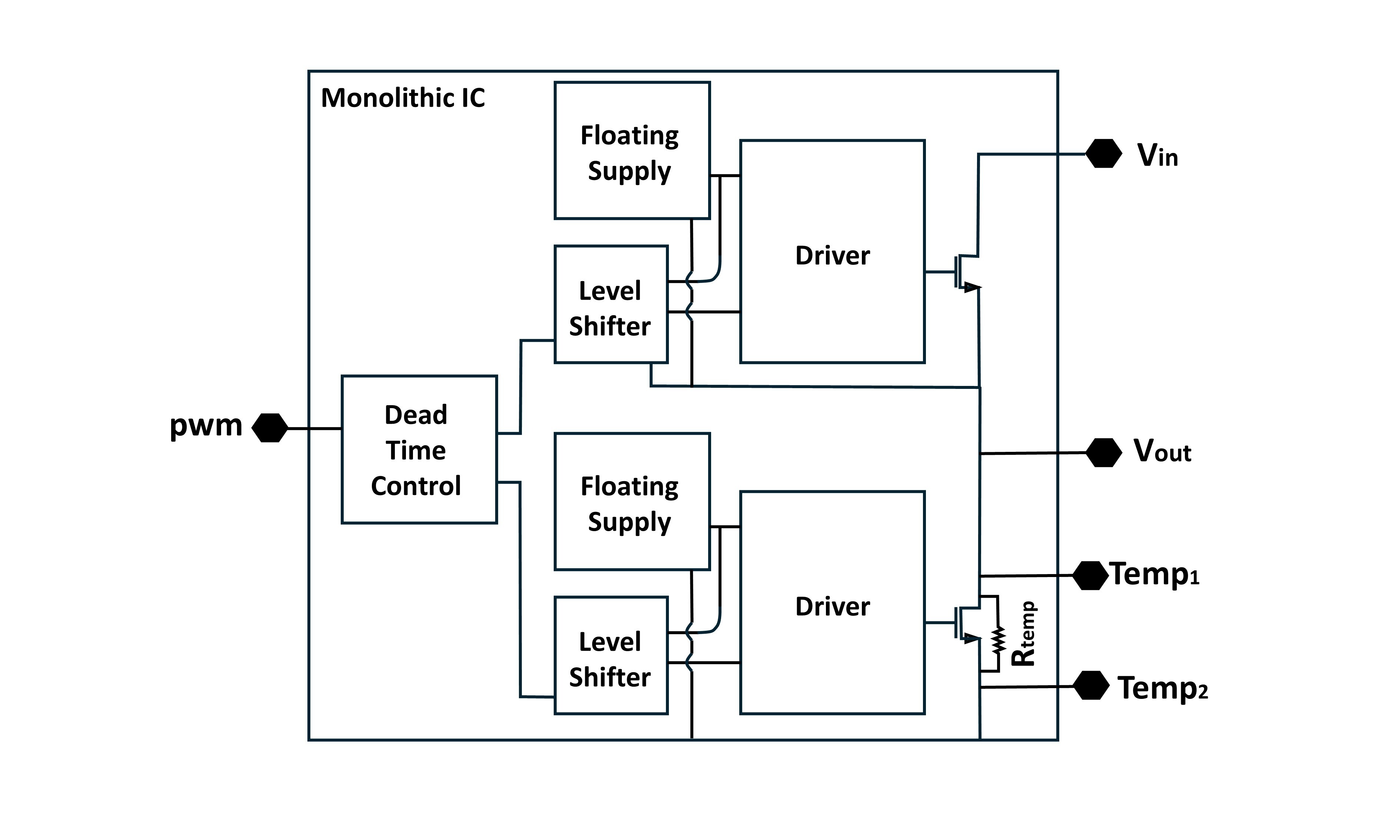 4. SloGaN. Monolithic GaN power stage and pre-driver (GaN half-bridge with integrated drivers and protection features).